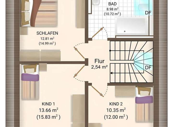Im Obergeschoss des Hauses finden Sie eine klassische Raumaufteilung. Drei Schlafzimmer und ein Badezimmer mit übergroßer Dusche und Badewanne sind geplant. Trotzdem sind zum jetzigen Planungsstand noch Änderungen möglich.