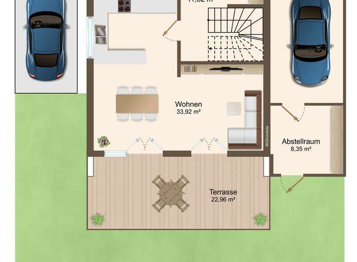 Das Haus besticht durch seine durchdachte Architektur, welche sich perfekt den Bedürfnissen vieler Menschen anpasst. Trotzdem sind zum jetzigen Planungsstand noch Änderungen möglich. Der großzügige Wohnbereich mit angrenzender offener Küche ist das Herzstück des Hauses und bietet viel Platz für gemütliche Stunden mit der Familie. Von hier aus gelangt man auch auf die schöne Terrasse, die sich über die komplette Breite des Hauses (7,5 Meter) erstreckt und teilweise überdacht ist. Stauraum befindet sich unter der Treppe, im Eingangsbereich und im Hauswirtschaftsraum. Ein Lagerraum hinter der Garage bietet zusätzlichen Stauraum.