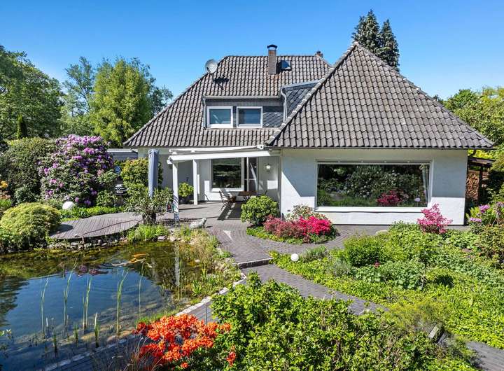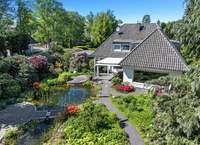 Das großzügige Wohn- und Esszimmer ist hier der Mittelpunkt des Hauses und wird neben dem schönen Kirschbaumparkett mit einem schönen Kachelofen abgerundet. Hier finden Sie sehr viel Platz für Familie und Freunde und können schöne gemeinsame Stunden verbringen. Das spektakuläre, riesige Fenster lässt Garten und Wohnzimmer im wahrsten Sinne verschmelzen. Durch die vielen und großen Fensterfronten haben Sie von jedem Platz in diesem Raum einen wunderschönen Blick in den Garten. Vom Esszimmer gelangen Sie auf die Überdachte Terrasse, auf der Sie viele herrliche Sonnenstunden verbringen können. Die Terrassenüberdachung beinhaltet eine elektrische Markise, um auch die heißen Sommertage in Ihrem neuen Gartenidyll genießen zu können. Von hier aus können Sie den traumhaft angelegten und gewachsenen Garten in vollen Zügen genießen. Neben den vielen schönen Bäumen und Rhododendren finden Sie hier zwei traumhaft angelegte Teiche mit einer Filteranlage. Der gesamte Garten wird automatisch über eine Bewässerungsanlage versorgt und wurde im gesamten fachmännisch angelegt und erstellt. Selbstverständlich besteht hier aber die Möglichkeit sich ebenso eine großzügige Rasenfläche zum spielen für die Kleinen zu erschaffen. Das Grundstück gibt dies aufgrund der Größe in jedem Fall her.