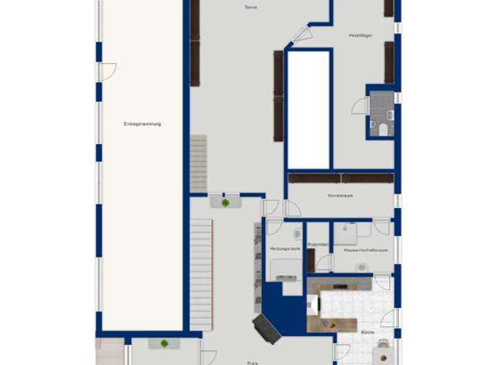 Zum Anwesen gehören außerdem eine große, charakteristische Tenne mit diversen Nebenräumen sowie ein großzügiger Heuboden, der potenziell als zusätzliche Ausbaureserve dienen könnte.