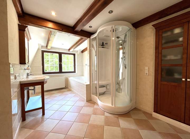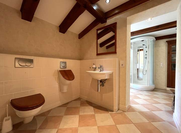 Für modernen Wohnkomfort sorgen eine Fußbodenheizung im Wohnzimmer, Esszimmer, Bad und Gäste-WC sowie ein im Jahr 2013 vollständig saniertes Vollbad. Auch das Gäste-WC wurde im Zuge der letzten Jahre modernisiert. Die Beheizung erfolgt über eine Ölheizung, die in Kombination mit einer Wärmepumpe für die Warmwasserbereitung arbeitet. Dank der niedrigen Vorlauftemperatur bietet das Haus gute Voraussetzungen für einen späteren Umstieg auf eine moderne Wärmepumpenheizung.