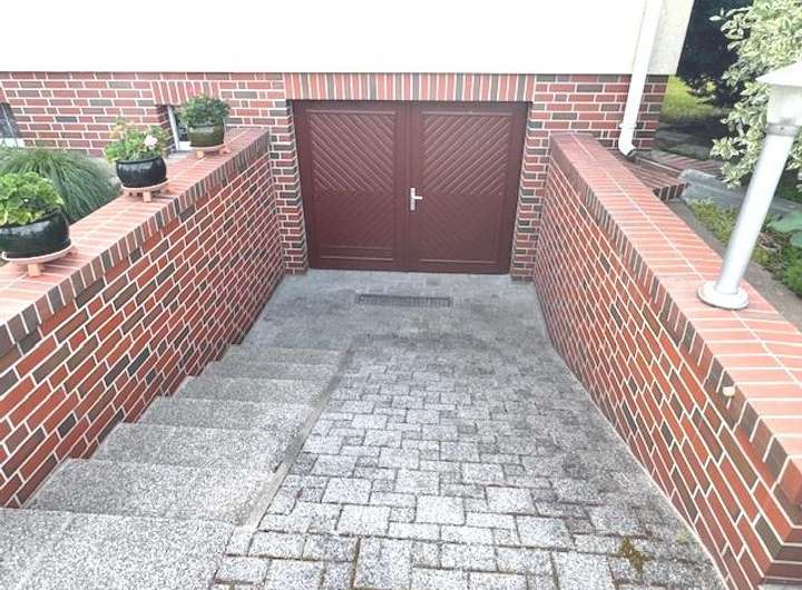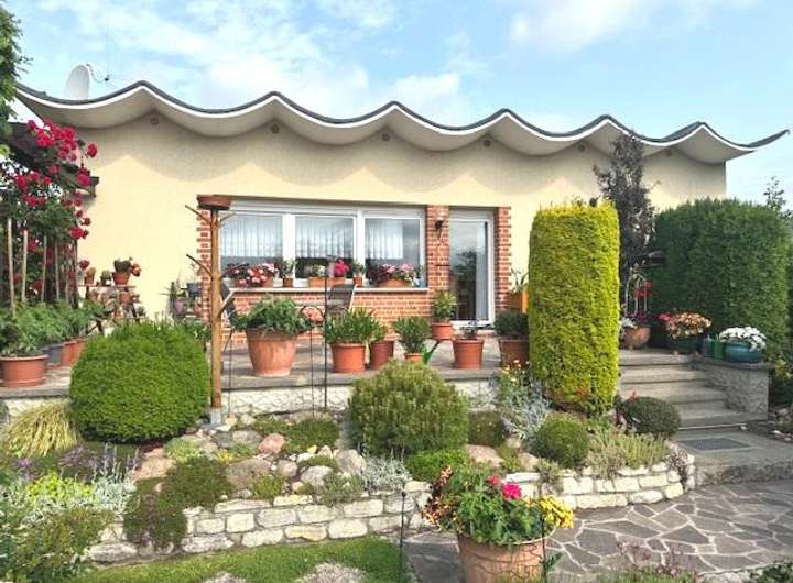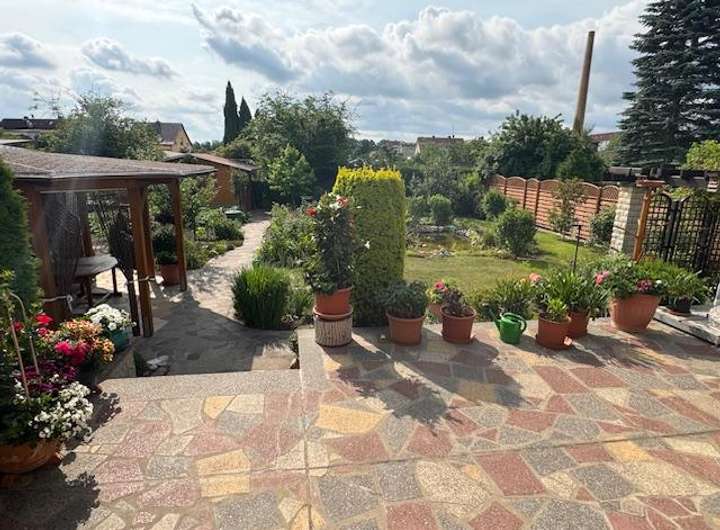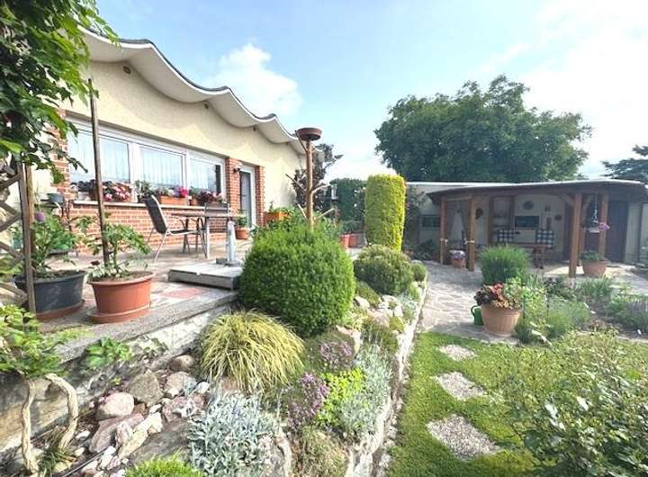 Betreten oder befahren Sie das Grundstück durch die elektrisch und auch mit Fernbedienung zu öffnende Toranlage, stellen Sie sofort den gepflegten Zustand der geschmackvollen Gartenbepflanzung fest. Dies setzt sich bis in den letzten Winkel des Grundstücks fort. Neben der ersten straßenseitigen Tiefgarage, die von der Nutzung her dem Kellerraum zugeordnet wurde, kommen Sie von der Einfahrt vorbei am Hauseingang zur tatsächlich aktuell genutzten Garage. Daran rechts vorbei finden Sie im reichlich bepflanzten Garten unterschiedliche Entspannungsplätze. Dazu gehört der zentral platzierte Gartenpavillon, unter dessen Dach Sie auch bei Regen das Grundstück genießen können. Ein gepflasterter Weg führt zu weiteren Ruhezonen, wie dem Gartenteich oder am Ende des Grundstücks das Gartenhäuschen. Auf diesem Grundstück können Sie mit der ganzen Familie gleichzeitig angenehme Freizeit verbringen und trotzdem können sich die Einzelnen an unterschiedlichen Rückzugsorten aufhalten. Der gepflegte Zustand des Gartens setzt sich natürlich im Haus fort. Betreten Sie das Wohnhaus über den überdachten Treppenaufgang, kommen Sie zunächst in einem Flur an, von dem rechts eine Tür zum Kellerabgang führt. Durch den Flur geradeaus weitet sich dieser in eine großzügig gestaltete Diele auf, von der es in die anderen Räume geht. Diese sind rechts die L-förmige Küche mit bequemem Essplatz und den Einbaumöbeln, die dem Erwerber, im Kaufpreis enthalten, überlassen werden. Weiterhin gibt es das Wannenbad mit zusätzlich bodentiefer Dusche. Dahinter kommen dann ein von den jetzigen Eigentümern so genutztes Gästezimmer und ein Arbeitszimmer. Auf der anderen Seite der Diele sind die Zugänge zum Schlafzimmer und zum Wohnzimmer mit direktem Ausgang zur großen Terrasse, die einen weiteren Freiluftrückzugsort und einen herrlichen erhöhten Blick über das gesamte Grundstück bietet. Der Keller, betretbar aus dem Garten direkt oder über die Treppe im Flur, ist durch seine klare Struktur, geflieste Böden und gut dimensionierte Raumhöhen sehr angenehm zu empfinden. Hier befinden sich neben der Heizung unterschiedliche Räume mit unterschiedlichen Nutzungen und viel zusätzlichem Stau- und Lagerraum.