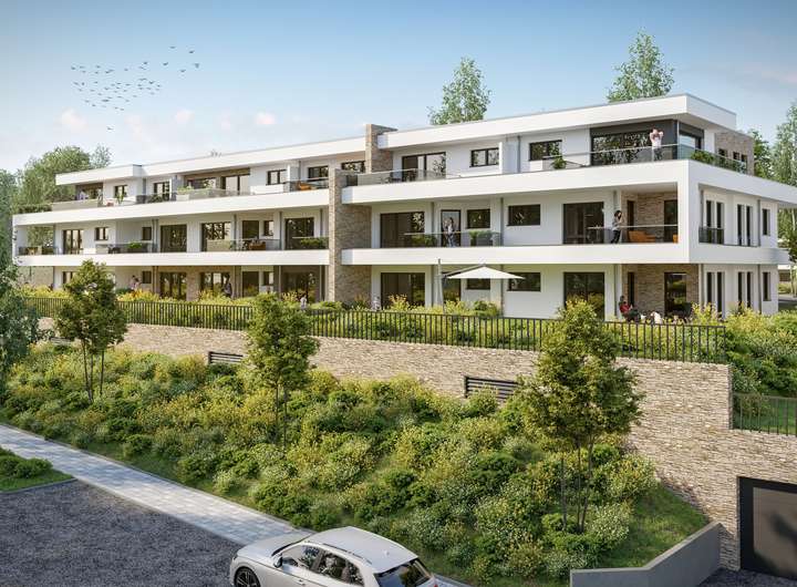 Das 3-geschossige Mehrfamilienhaus gewinnt durch die klare Gliederung der Fassade. Die Wohnungen überzeugen durch ihre gelungene Verbindung von Licht, Exklusivität und optimaler Nutzungsmöglichkeit. Die Wirkung der bodentiefen Fenster mit der feinen Unterteilung wird durch die transparenten Balkonbrüstungen unterstrichen. Farben, Formen und Materialien sind aufeinander abgestimmt. Eine besondere Atmosphäre entsteht in den Staffelgeschoss-Wohnungen.