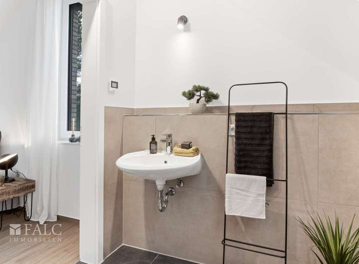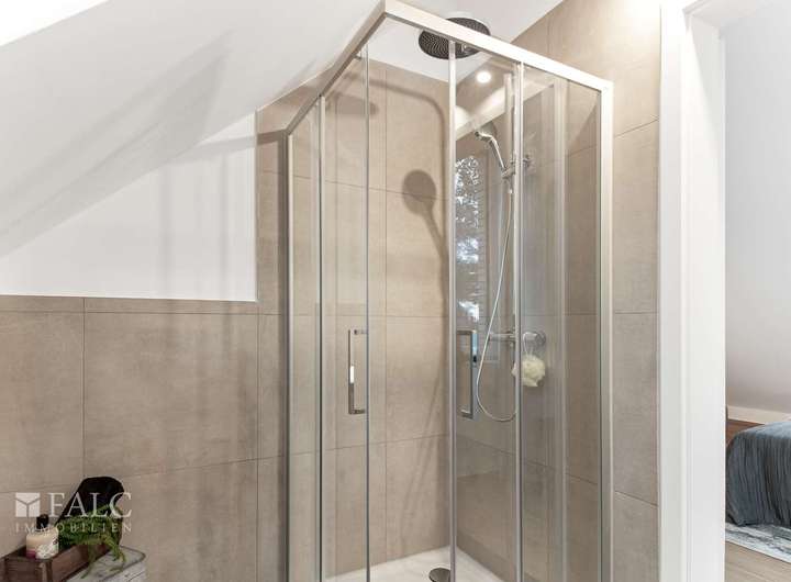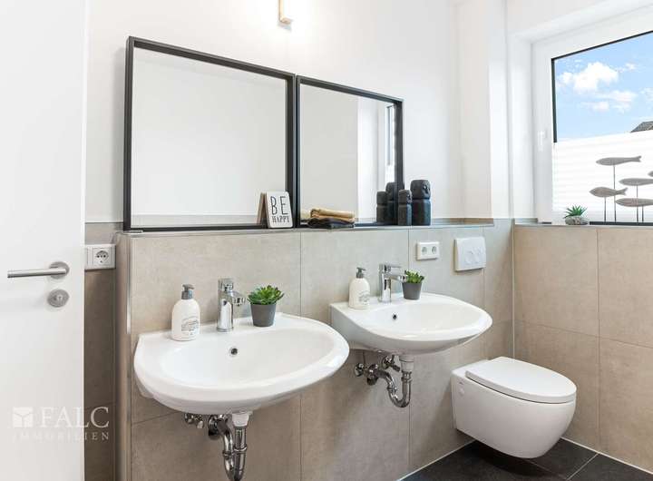 Insgesamt verfügt das Haus über zwei moderne Badezimmer, die mit Duschen samt Rainshower, hochwertigen Markenarmaturen, eleganter Badewanne und großformatigen Fliesen überzeugen. Handtuchheizkörper sorgen zusätzlich für ein angenehmes Wohlfühlklima.