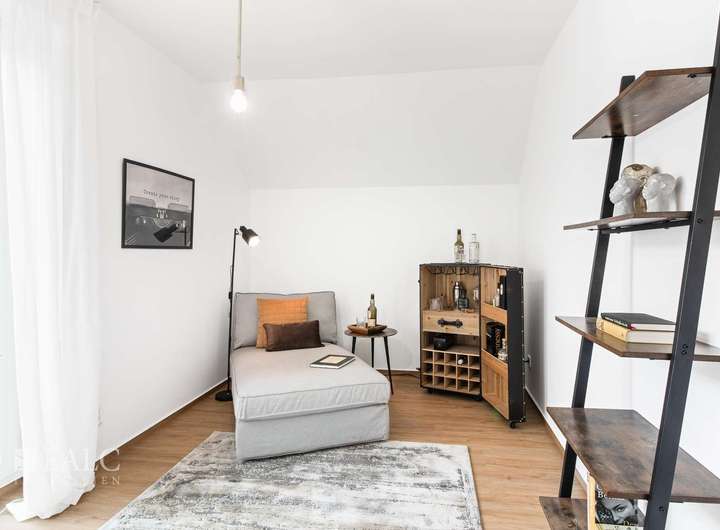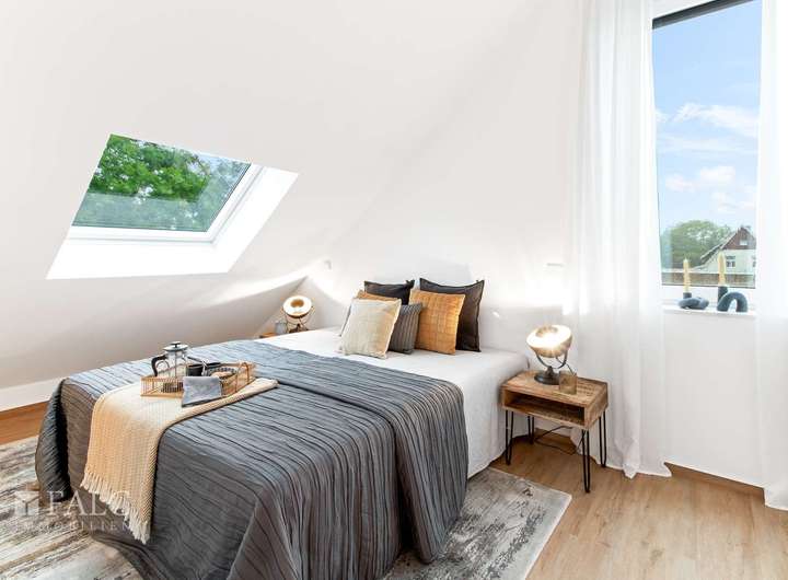 Im Obergeschoss befinden sich zwei großzügige und lichtdurchflutete Kinderzimmer – ein perfekter Rückzugsort für den Nachwuchs oder auch ideal als Büro oder Gästezimmer nutzbar. Zudem bietet das Obergeschoss ein voll ausgestattetes Badezimmer mit Dusch und Badewanne, sowie einem geräumigen Hauswirtschaftsraum (inkl. Anschluss für die Waschmaschine). Im Dachgeschoss erwartet Sie das Hauptschlafzimmer mit viel Privatsphäre sowie einem eigenen, stilvoll ausgestatteten Bad en Suite – ein echtes Highlight für Eltern oder anspruchsvolle Bewohner, die Wert auf Komfort legen.