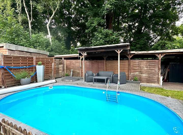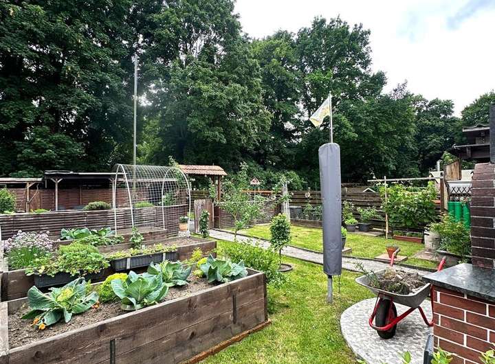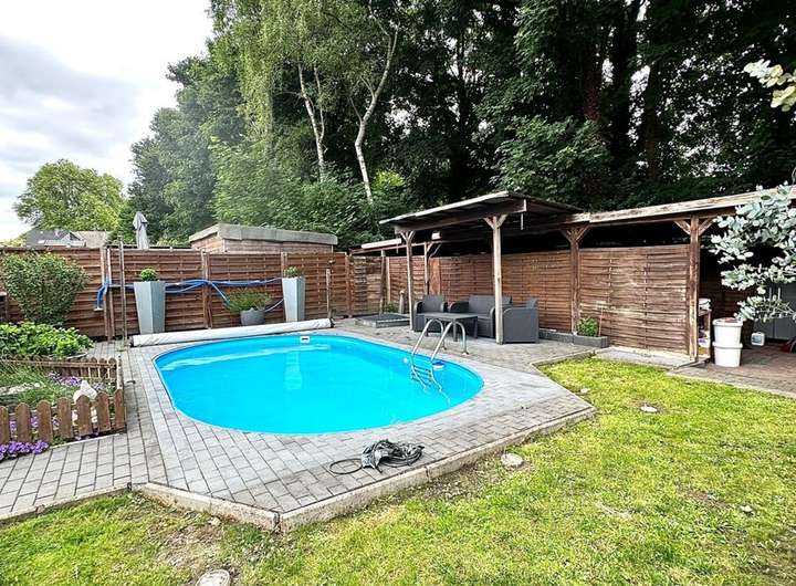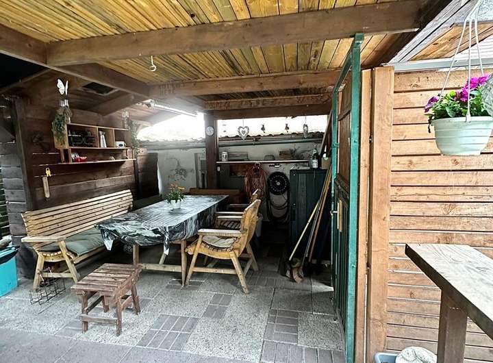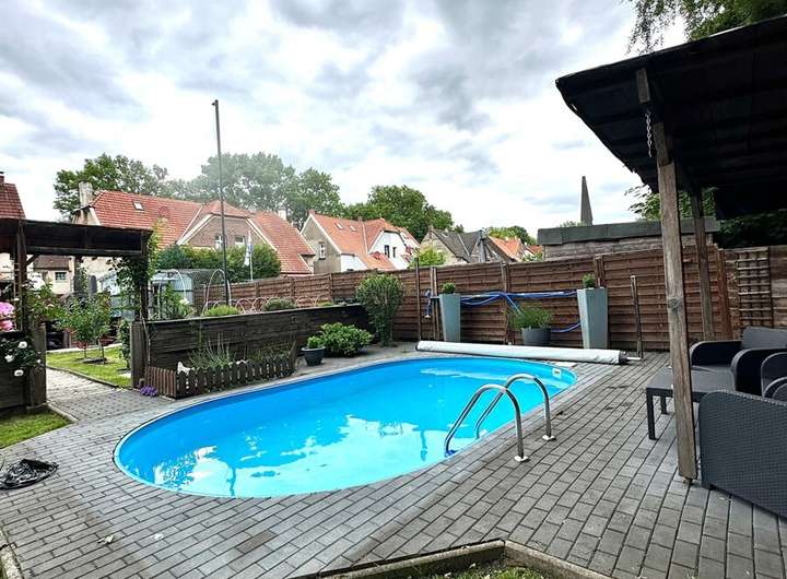 Das Grundstück bietet alles, was das Herz begehrt: Ein gepflegter Garten mit überdachter Terrasse, einem Pool für heiße Sommertage sowie einer begrünten Fläche zum Spielen und Entspannen. Drei Stellplätze sowie ein geräumiger Schuppen runden das Angebot ab.