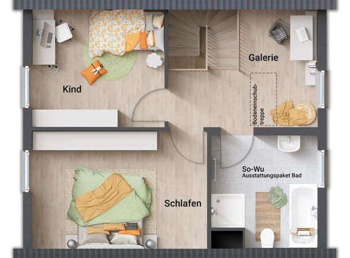 Einzigartig in seiner Möglichkeit, deine Handwerkskunst zu entfalten, bietet dieses Haus die Freiheit, bei der Ausstattung Geld zu sparen. Sanitäranlagen, Fliesen oder Innentüren – durch deine persönliche Note wird es zu einem Spiegel deiner Individualität. Eine großzügige Bodeneinschubtreppe in der Galerie lädt zum Ausbau des Dachgeschosses ein und lässt die Träume in die Höhe wachsen.