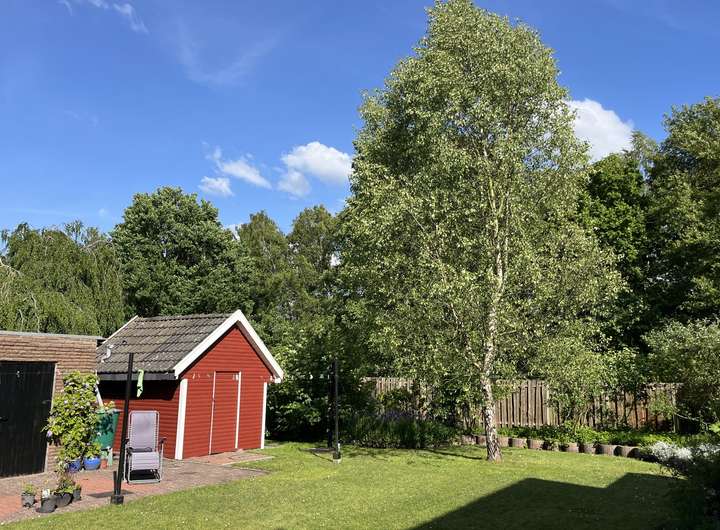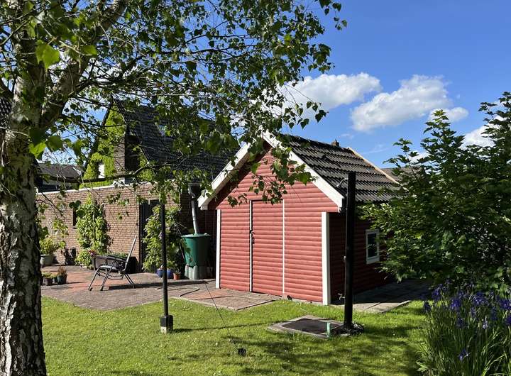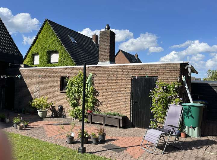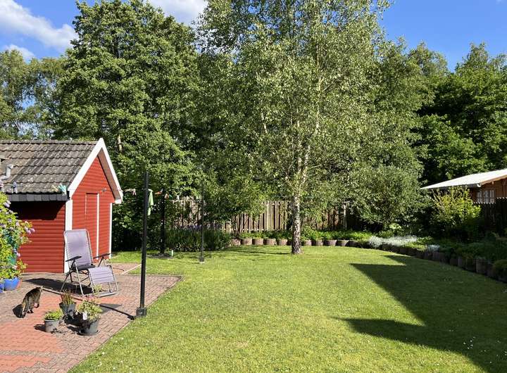 Der liebevoll angelegte Garten ist ein echtes Highlight: gepflegte Rasenflächen, ein Gartenhaus und eine große ans Haus angebaute überdachte Terrasse mit gemauertem Kamin laden zum Verweilen ein – ob für ruhige Abende im Kreis der Familie oder gesellige Grillabende mit Freunden.
