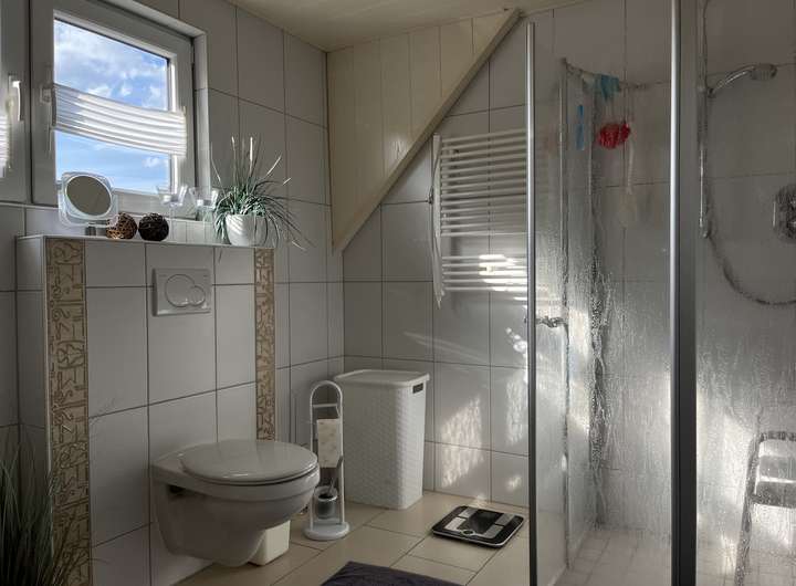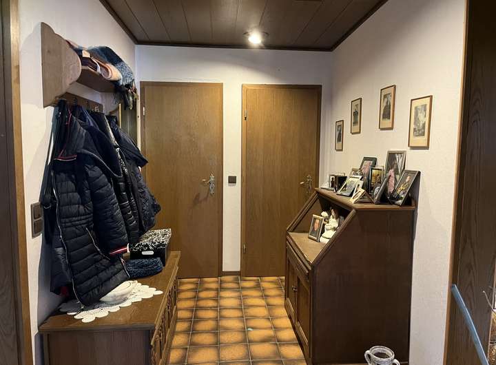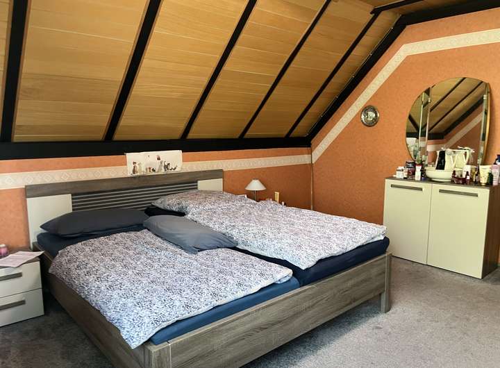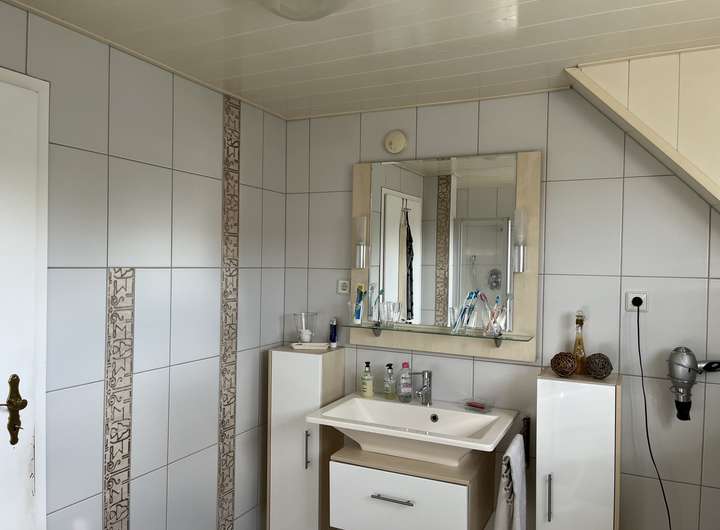 Über eine stilvolle Treppe gelangen Sie ins Obergeschoss. Dort erwarten Sie drei gut geschnittene Schlafzimmer, die vielfältige Nutzungsmöglichkeiten bieten – ob als Kinderzimmer, Büro oder Gästezimmer. Das Badezimmer auf dieser Etage wurde vor etwa zehn Jahren vollständig saniert und präsentiert sich modern, zeitlos und gepflegt.