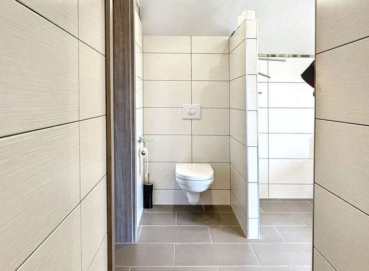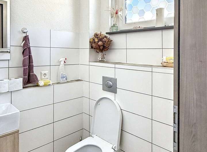 - Separates Gäste-WC im Erdgeschoss mit sandsteinfarbenen Fliesen