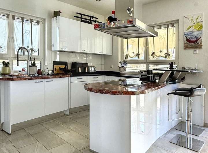 - Die offen gestaltete Einbauküche (Firma Alno) mit edler Marmor-Arbeitsplatte begeistert mit hochwertigsten Geräten
