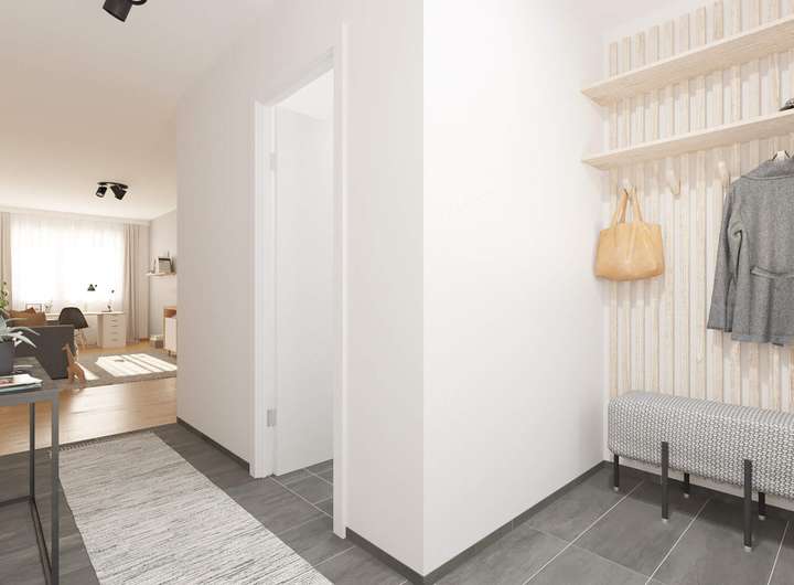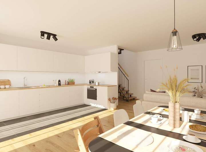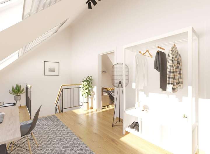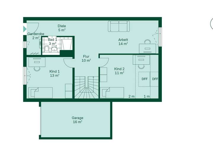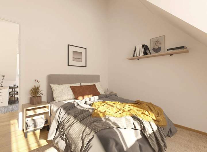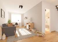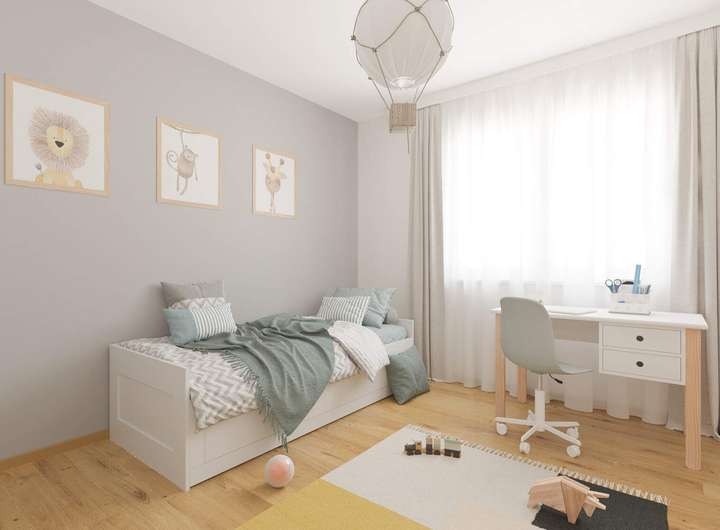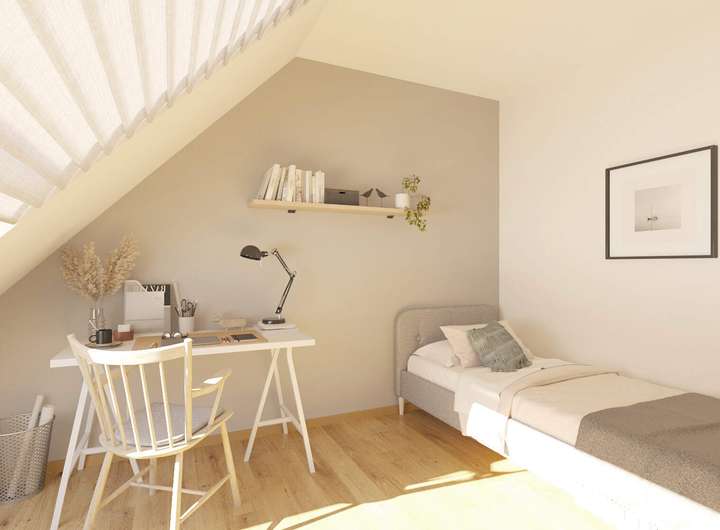 Im Erdgeschoss finden Sie zwei gemütliche Kinder- und ein Arbeitszimmer, perfekt für Home Office oder Ihr Hobby. Eines der beiden Bäder befindet sich neben dem Eingang. Die Garage bietet Schutz für Ihr Auto. Im Obergeschoss erwarten Sie ein Schlafzimmer mit Ankleide und ein weiteres modernes Bad, wodurch Ihr Zuhause elegant vollendet wird.