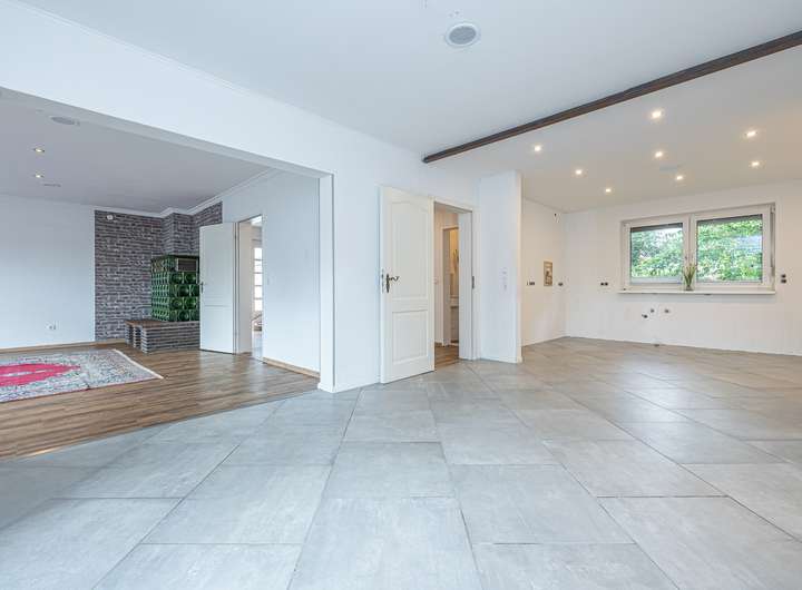 Der helle und gemütliche Wohnbereich mit einem zauberhaften Kamin erstreckt sich über Eck in den offenen Essbereich. Die Gestaltung der Küche ist bei diesem Raumkonzept kaum Grenzen gesetzt. Große Fensterfronten sorgen für ein lichtdurchflutetes Ambiente und bieten direkten Zugang zur sonnigen Südterrasse sowie zum liebevoll gestalteten Garten.