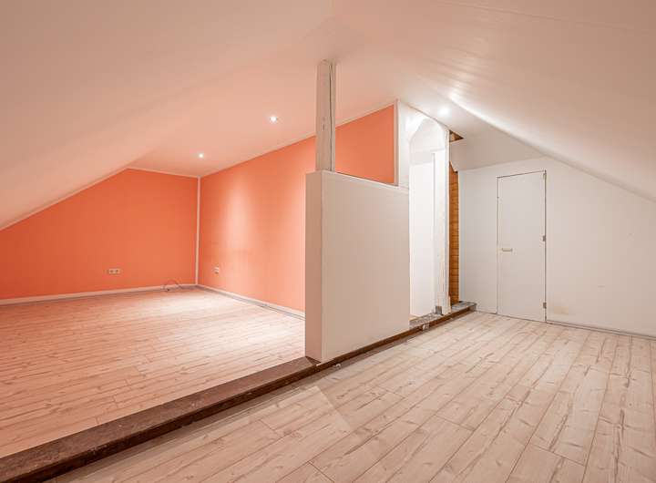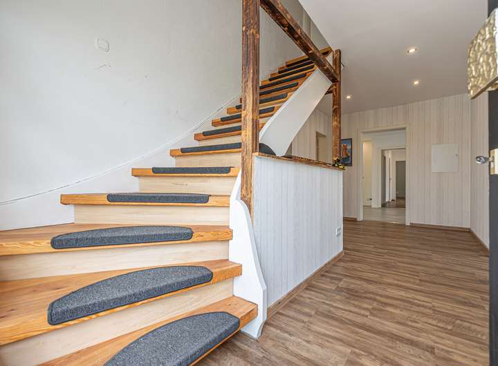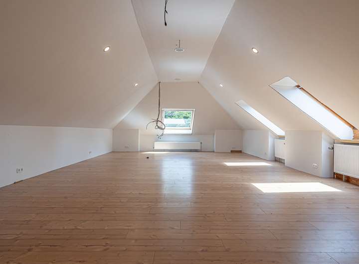 Über eine feste Treppe gelangen Sie ins Dachgeschoss mit einer großzügigen Nutzfläche von ca. 100 m² – ideal für Hobbys, Lagerflächen oder zum weiteren Ausbau.
