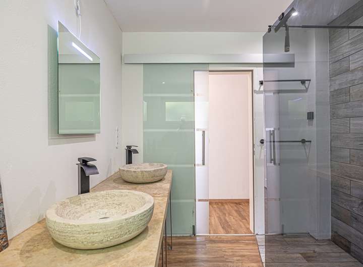Ein Flur führt von der Küche zu drei weiteren Zimmern und einem charmant renovierten Duschbad mit zwei schnuckeligen Waschbecken und einem Abstellraum.