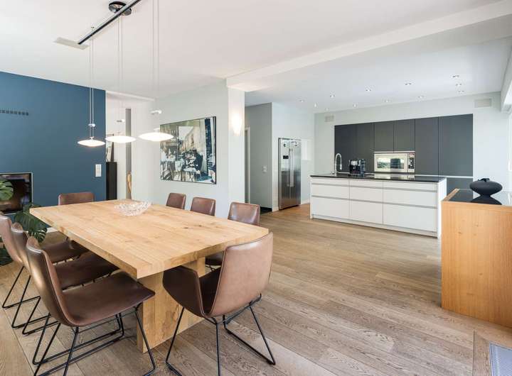 - Marken-Einbauküche (Alno) mit matt anthrazitfarbenen bzw. mattweißen Fronten, Koch-/Arbeitsinsel mit beidseitigem Stauraum sowie schwarzen Granit-Arbeitsflächen, ausgestattet mit breitem Cerankochfeld, breitem Backofen (beides Küppersbusch), Geschirrspüler (Miele, neu in 2020), Side-by-Side-Kühl-Gefrier-Kombination mit innenliegendem Icemaker (Siemens), Edelstahl-Spülbecken samt Gastro-Armatur