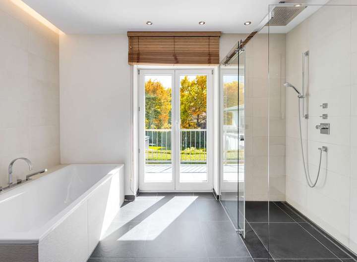 - Masterbad (Obergeschoss), gestaltet mit antrazitfarbenen Bodenfliesen in Schiefer-Optik und cremefarbene Wandfliesen, ausgestattet mit Badewanne, bodengleicher Walk-in-Dusche mit Glas-Schiebetür und Rainsky, breitem Doppel-Waschtisch samt zweier Einsatzbecken (Villeroy & Boch), Unterschrank und Dornbracht-Unterputzarmaturen, Spiegelschrank, WC, Deckenspots hybrider Fußbodenheizung