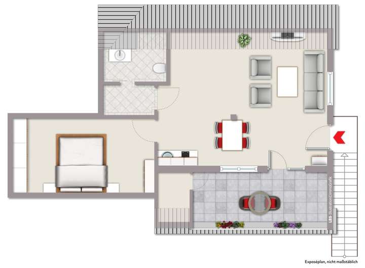 Zimmer: 2 (Wohn-/Essbereich, Schlafzimmer, Bad)