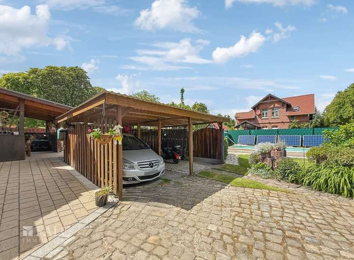 Zur kostensparenden Bewässerung steht Ihnen ein eigener Brunnen zur verfügung. Ein elektrisches Tor sorgt für Sicherheit und Komfort, während das Doppelcarport Ihre Fahrzeuge vor Wind und Wetter schützt. Ein Rasenroboter (inklusive) sorgt außerdem dafür, dass Ihre Rasenfläche immer perfekt gepflegt ist. Ein praktisches Gartenhaus bietet zusätzlichen Stauraum für Ihre Gartengeräte oder Fahrräder.