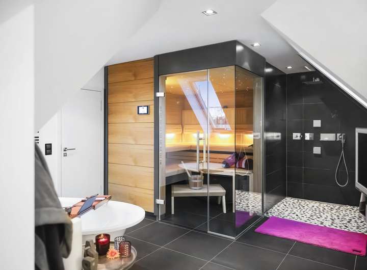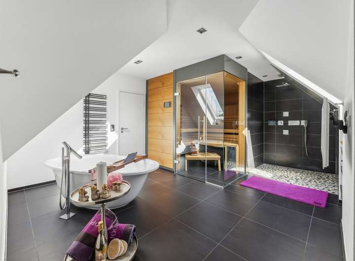 - Das Hauptbadezimmer im Obergeschoss verfügt des Weiteren über eine freistehende Badewanne und eine luxuriöse Klafs-Sauna mit Dampfsaunafunktion, Radioanschluss und Sternenhimmel
