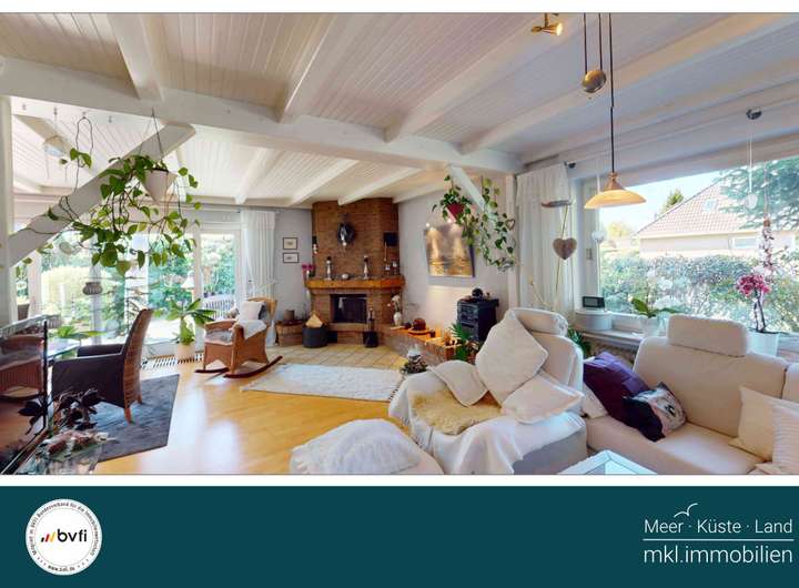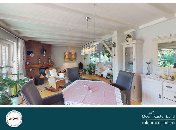 Schon beim Betreten des Hauses spürt man das Besondere: Das großzügige Wohn- und Esszimmer mit seinem stilvollen Kamin ist das Herzstück des Hauses. Hier genießen Sie stimmungsvolle Abende mit der Familie oder Freunden – Wärme, Licht und Gemütlichkeit verschmelzen zu einem Wohngefühl, das man einfach nur lieben kann.