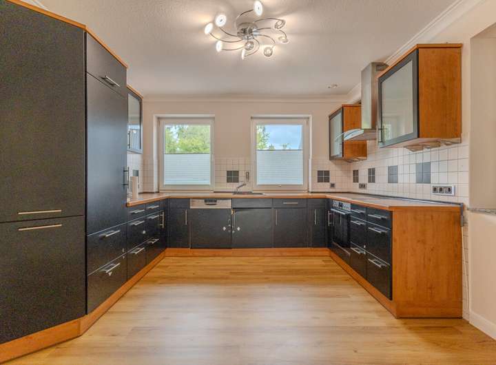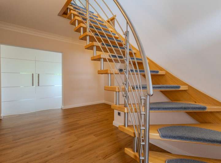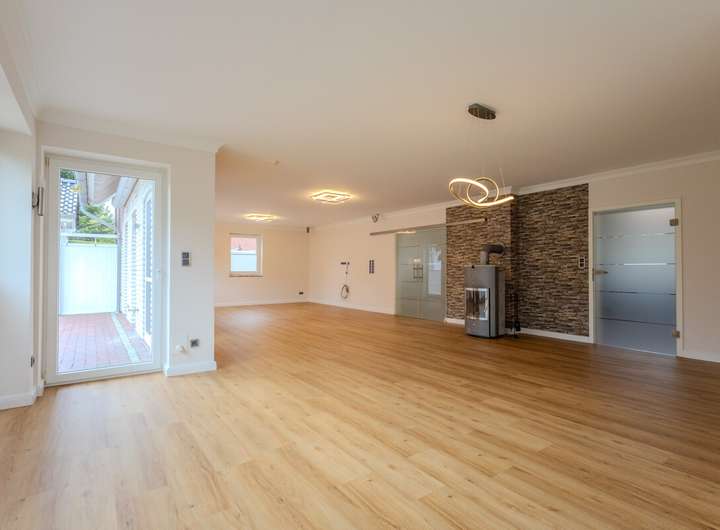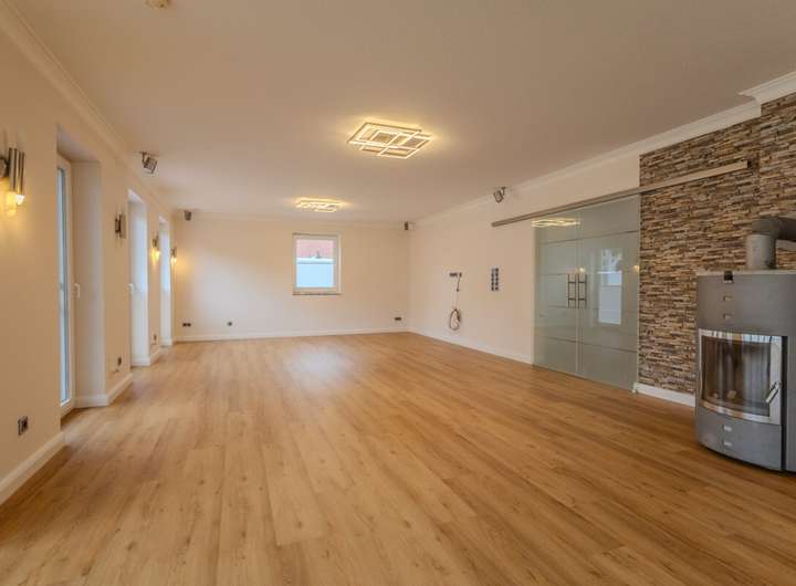Im Inneren erwartet Sie eine durchdachte Raumaufteilung mit insgesamt vier Schlafzimmern sowie einem separaten Büro, das sich hervorragend für Homeoffice-Zwecke eignet. Der offene Wohn- und Essbereich bildet das Herzstück des Hauses. Ein Kamin sorgt hier nicht nur für behagliche Wärme, sondern auch für eine gemütliche Atmosphäre. Große Fensterflächen lassen viel Licht ins Innere und schaffen eine freundliche Wohnatmosphäre.