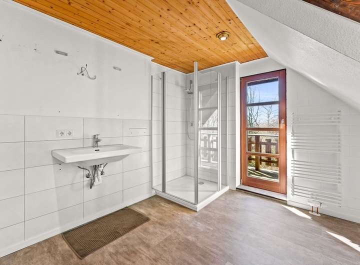 Das Haus wurde laufend gepflegt und modernisiert – so wurde das Duschbad im Jahr 2021 erneuert. Ein Gäste-WC ist ebenfalls vorhanden. Für Fahrzeuge steht eine praktische Doppelgarage zur Verfügung. Die Beheizung erfolgt effizient und zukunftsorientiert über eine Wärmepumpe.