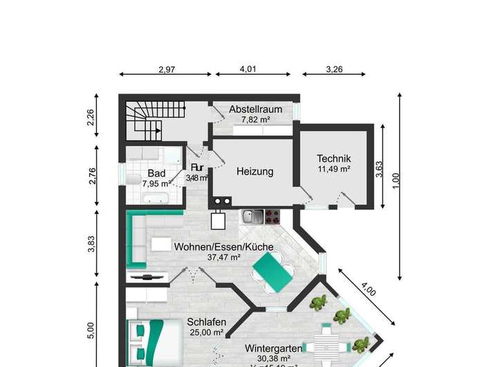 * Zisterne mit ca. 7.5 Kubik für Regenwasser