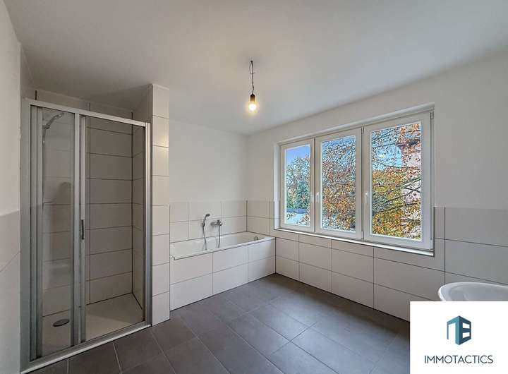 Das ruhig gelegene Schlafzimmer befindet sich auf der gegenüberliegenden Seite des Wohnbereichs und bietet direkten Zugang zum modernen Tageslichtbad. Dieses ist mit einer bodengleichen Dusche, einer komfortablen Badewanne sowie einem Handtuchheizkörper ausgestattet – für ein angenehmes Wohlfühlambiente.