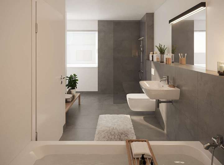 - Voll ausgestattetes Tageslichtbadezimmer mit Badewanne und bodengleicher Dusche inkl. Boden- und Wandfliesen
