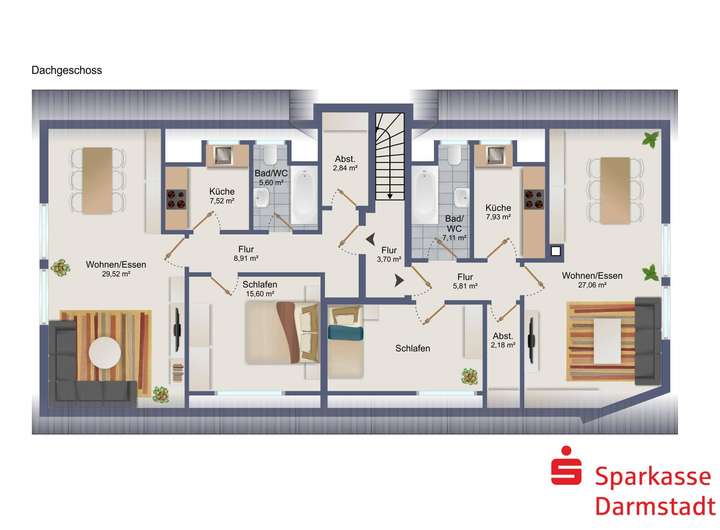 Das Dachgeschoss beherbergt zwei vermietete Wohnungen die nicht frei werden. Beide bestehen aus jeweils einem Flur, einem Abstellraum, einem Tageslichtbad mit WC, einer Küche, einem Schlafzimmer und einem geräumigen Wohn- und Esszimmer.