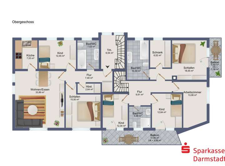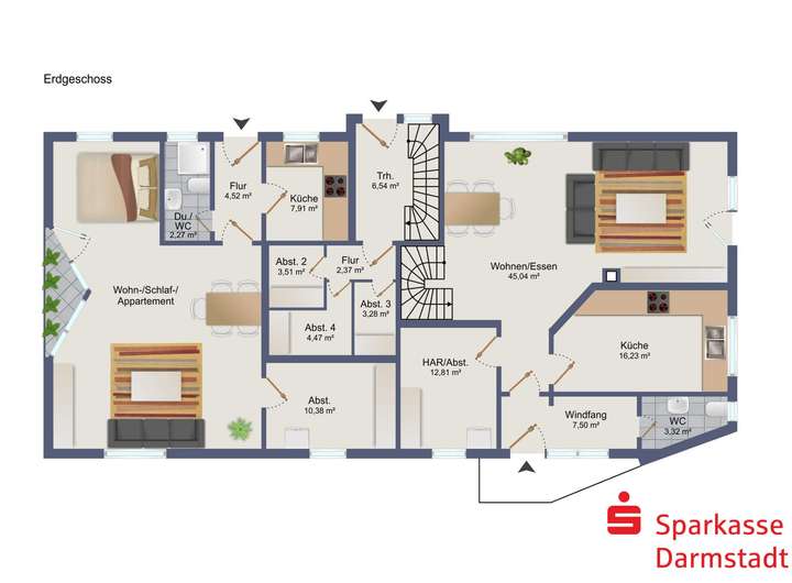 Die zweite Wohnung präsentiert sich als 5-Zimmer-Maisonette-Wohnung und erstreckt sich vom Erdgeschoss bis in das erste Obergeschoss mit separatem Hauseingang.