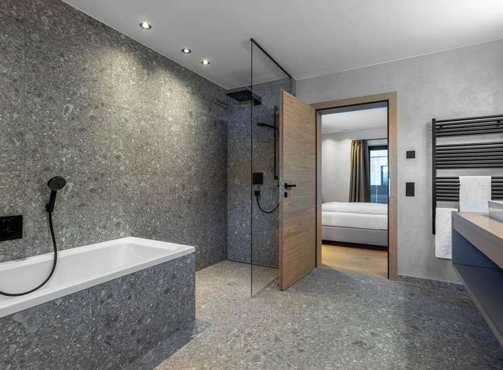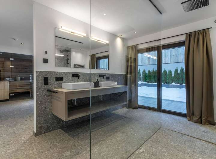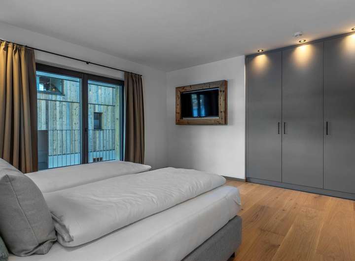 In dieser Etage finden Sie zwei geräumige Schlafzimmer vor. Von hier aus haben Sie Zugang auf den 16 m2 großen Balkon mit fulminantem Blick auf die umliegende Bergwelt. Weiters befinden sich zwei Bäder im Obergeschoss.
