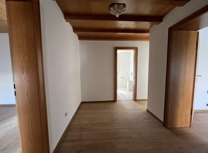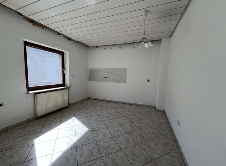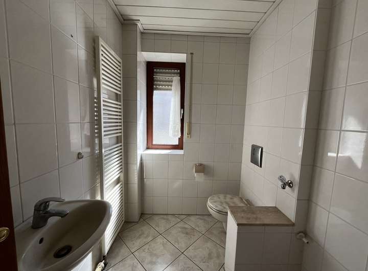 Über eine Treppe gelangen Sie ins 1. Obergeschoss des Hauses. Hier befinden sich drei weitere Räume. An eines der Zimmer schließt sich der großzügige Balkon an. Auch hier haben Sie wieder viel Platz für einen Grill, Tisch & Co. Dank der halben Überdachung kann man bei jedem Wetter geschützt draußen sitzen. Definitiv ein Plus an Wohn- und Lebensqualität. Im 1. Obergeschoss befindet sich weiterhin ein Tageslichtbad mit Dusche, Waschbecken und WC sowie ein zusätzliches Gäste-WC. Auch eine zweite Küche - ebenfalls mit Fenster - ist vorhanden. Auch hier können Sie Ihre eigenen Vorstellungen verwirklichen.
