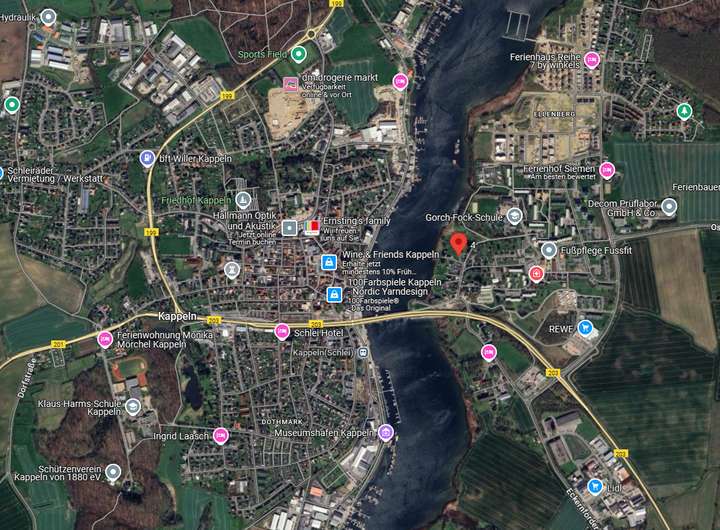 - Einkaufsmöglichkeiten: Auf der anderen Seite der Schlei (in Ihrem Sichtfeld) befindet sich die charmante Einkaufszone von Kappeln. Hier finden Sie alles für den täglichen Bedarf – von Supermärkten bis zu kleinen Boutiquen. Ein Rewe Supermarkt ist ebenfalls nur 900 m entfernt.