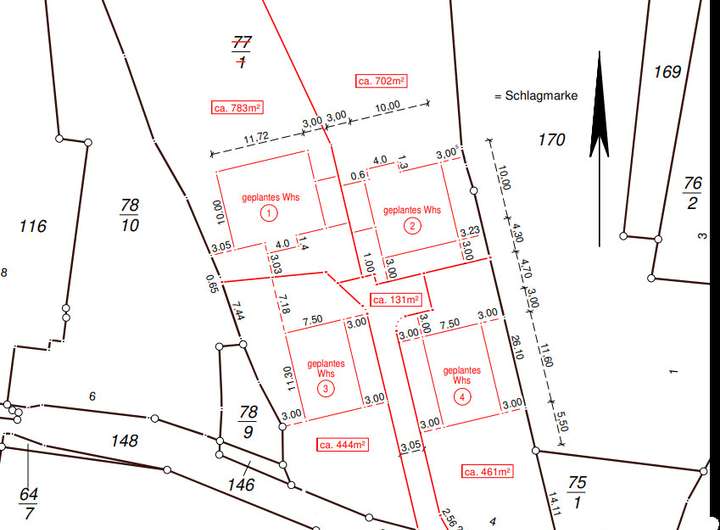 Das gesamte Grundstück umfasst eine Fläche von 2.532 m² und ist über einen Privatweg erschlossen. Die Grundstücksflächen wurden in vier separate Parzellen aufgeteilt, die jeweils mit einem Einfamilienhaus bebaut werden können.