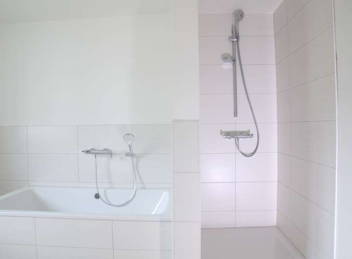 Bad mit Dusche, Badewanne und Fenster, Waschtisch, Waschmaschinen- und Trockneranschluss, gefliest mit hellen Feinsteinfliesen. Gäste WC.