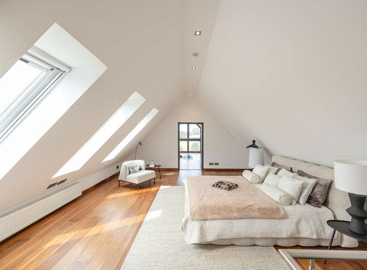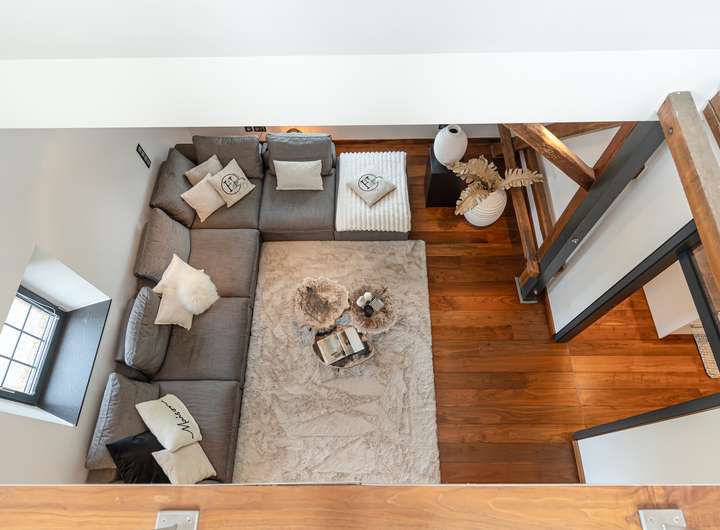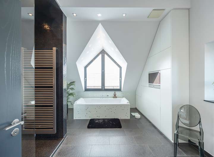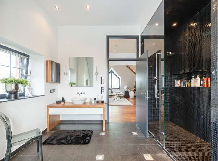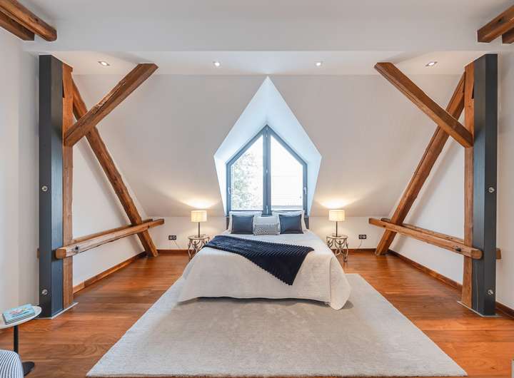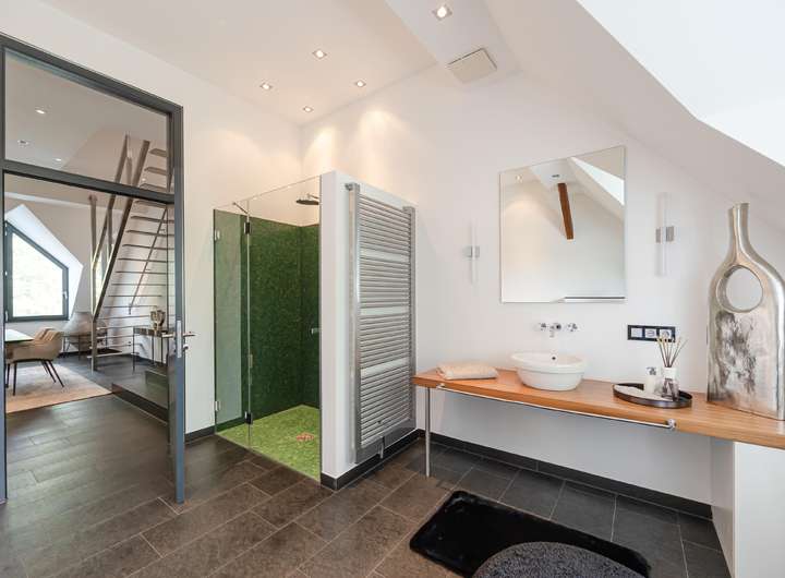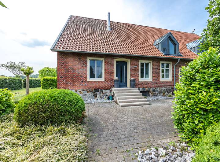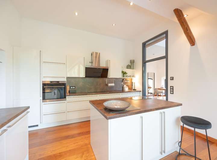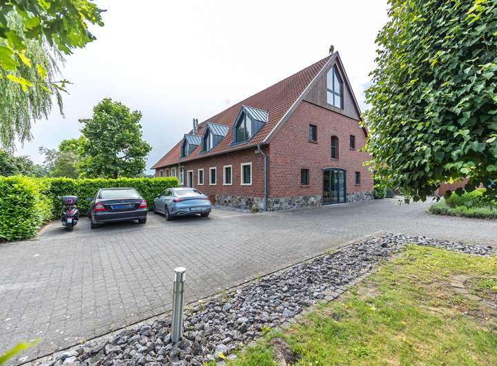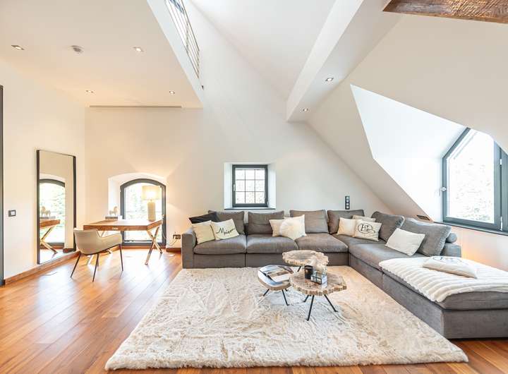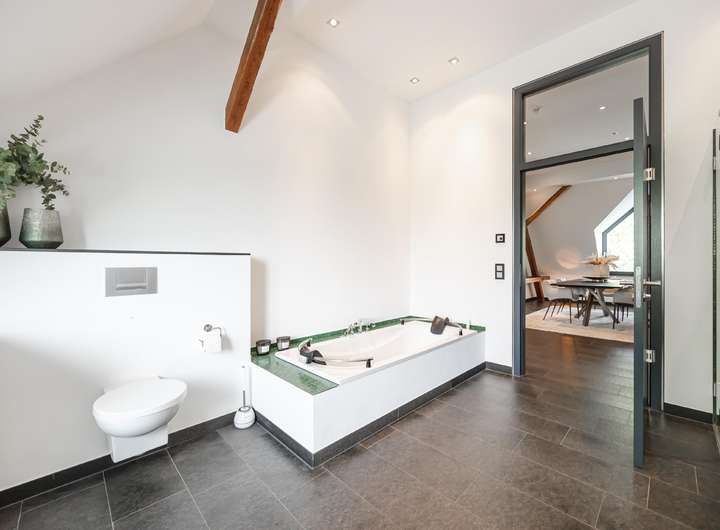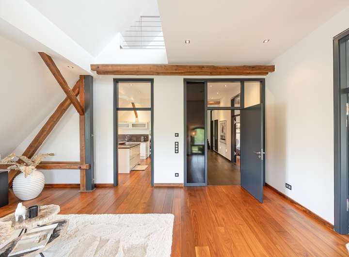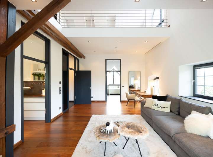 Diese besondere Maisonettewohnung besticht durch ihre Großzügigkeit und die ausgesprochen hochwertige Ausstattung. Die Wohnung bietet ca. 195 m² Wohnfläche verteilt auf 5 Zimmer mit diversen Nutzungsmöglichkeiten. Beim Betreten der Wohnung gelangt man direkt in den offenen Essbereich, direkt angrenzend befindet sich die separate Küche, welche mit einer modernen Einbauküche ausgestattet ist. Neben dem geräumigen Wohnzimmer bietet diese Ebene ein Schlafzimmer und zwei Bäder mit Wanne und Dusche. Über eine offene Treppe gelangt man vom Essbereich in die obere Ebene. Hier befinden sich zwei weitere Räume, die zum Beispiel als Schlaf- und Arbeitszimmer genutzt werden können. Das Arbeitszimmer bietet durch die Galerie einen spannenden Blick in das Wohnzimmer, durch die große Fensterfront aber auch eine herrliche Weitsicht über die angrenzenden Wiesen. Hervorzuheben ist die ausgewählte Ausstattung der Wohnung, Beispiele hierfür sind die Natursteinböden, das südamerikanische Walnuss-Parkett, die Design-Badezimmer mit Whirlpool-Badewanne, die freigelegten Holzbalken, zahlreiche Deckenstrahler und die Fußbodenheizung in der unteren Ebene. Die hohen Decken unterstreichen die Großzügigkeit dieser lichtdurchfluteten Wohnung. Dank des Glasfaseranschlusses besteht eine sehr gute Internetanbindung. Die Alarmanlage und das Tor mit Sprech- und Videoanlage sorgen für Sicherheit. Ein eigener PKW-Stellplatz und eine Abstellfläche im Keller sind ebenfalls vorhanden. Gerne zeigen wir Ihnen diese beeindruckende Wohnung bei einer Besichtigung!