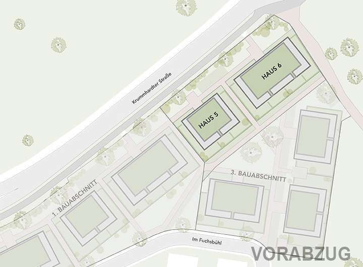 Die Realisierung des neuen Quartiers mit seinen durchmischten Wohnformen ist in mehreren Bauabschnitten geplant. Mit einem Quartiershof und einer gemeinsamen Tiefgarage entsteht ein lebendiges und dennoch einheitlich gestaltetes Ensemble, bei dem die Architektur eine Verbindung zu dem angrenzenden Landschaftsraum herstellt. Im ersten Bauabschnitt sind 26 Wohnungen in zwei Gebäuden geplant. Das offene Wohnareal bildet den neuen, Identität stiftenden Ortseingang von Schanbach. Umgeben von Feldern, Wiesen und Wald, bietet der Standort an der Krummhardter Str. / Im Fuchsbühl seinen Bewohnern eine besondere Lebensqualität. Die direkte Verbindung zur Naturlandschaft sowie der ruhige und hochwertig ausgestattete Innenhof laden zur aktiven Freizeitgestaltung, aber auch zum Entspannen und Ausatmen ein. Die Häuser befinden sich auf einer Hochfläche, wodurch sich eine attraktive Hanglage mit Weitblick ergibt. Die erhöhte Lage rückt das Remstal mit seinen Weinbergen und den angrenzenden Schurwald angenehm in den Fokus. Ein Panorama, das für Hochgefühle sorgt! Die direkte Nähe zu Esslingen am Neckar erweitert das Leben im Grünen um die praktischen Annehmlichkeiten der Großen Kreisstadt.