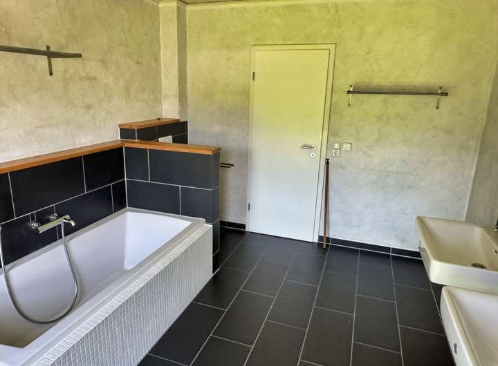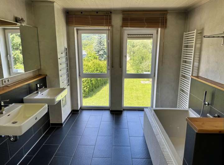 Das Obergeschoss ist sehr praktisch aufgeteilt. Hier stehen dem künftigen Eigentümer insgesamt vier große und helle Schlafzimmer sowie das tolle Hauptbad mit Badewanne, Doppelwaschbecken und grandiosem Ausblick in den Garten und die Natur zur verfügung.
