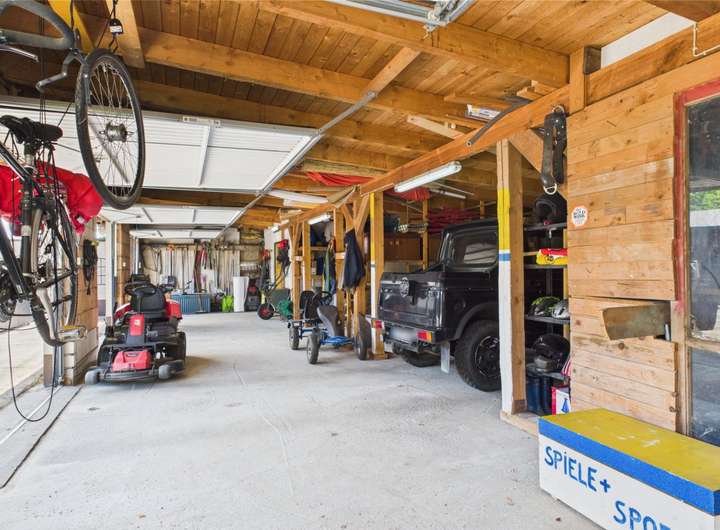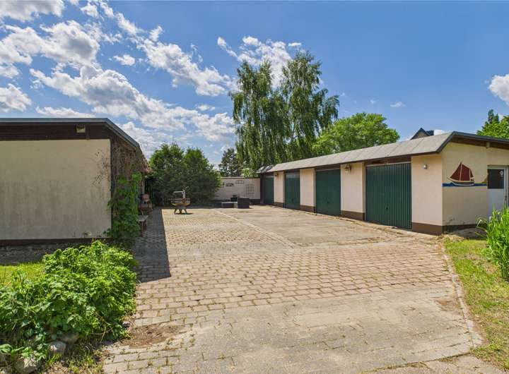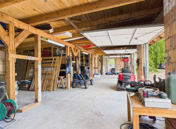 Vier Garagen mit integrierter Werkstatt bieten Platz für Fahrzeuge, Hobbys oder handwerkliche Projekte.