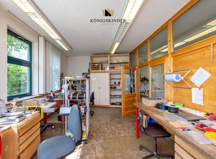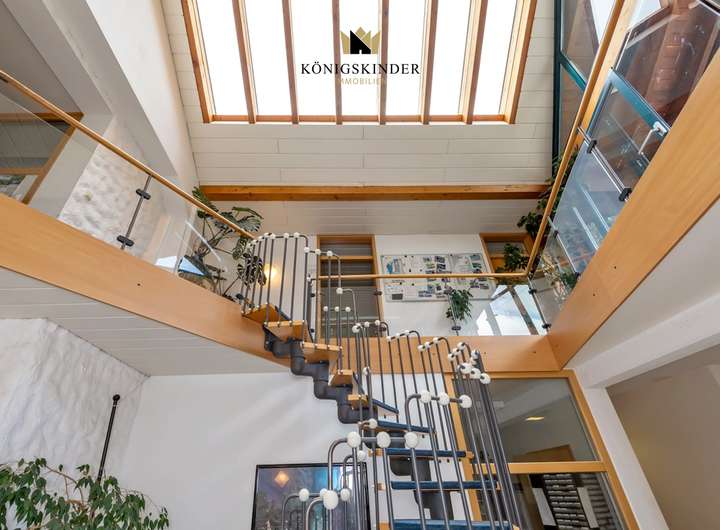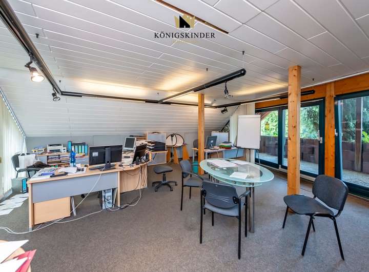 Aktuell als 4-Zimmer-Büro genutzt, mit beeindruckender Dachterrasse (143 m²). Eine Umnutzung zu offenem, hellem Wohnraum ist denkbar. Auch eine gewerbliche Nutzung mit Vermietung bleibt eine attraktive Option.