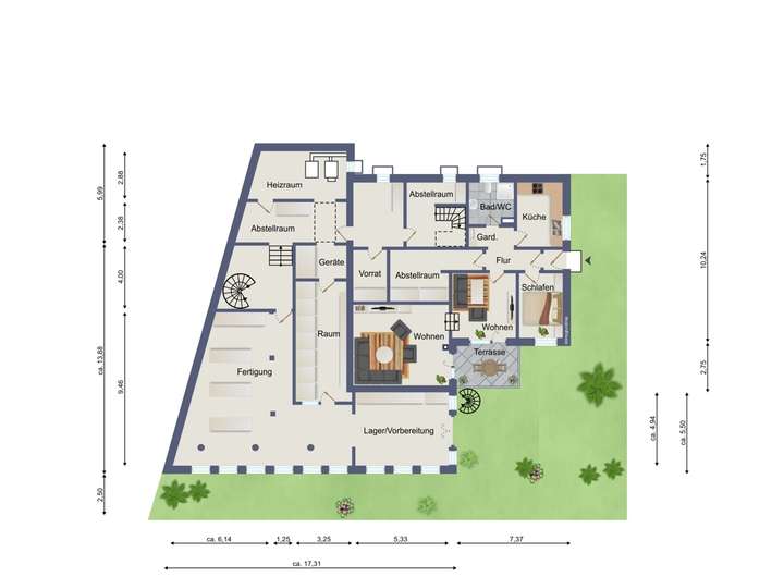 Die gesamte Nutzfläche beträgt großzügige 615,63 Quadratmeter. Das Objekt vereint Wohnkomfort mit gewerblicher Flexibilität und bietet Raum für individuelle Gestaltung – sei es für die Eigennutzung, als Mehrgenerationenhaus oder renditestarke Kapitalanlage.