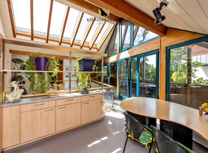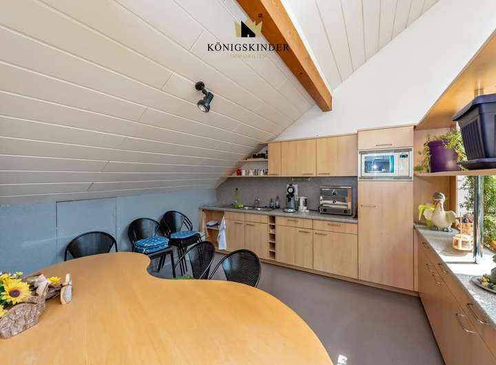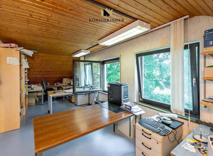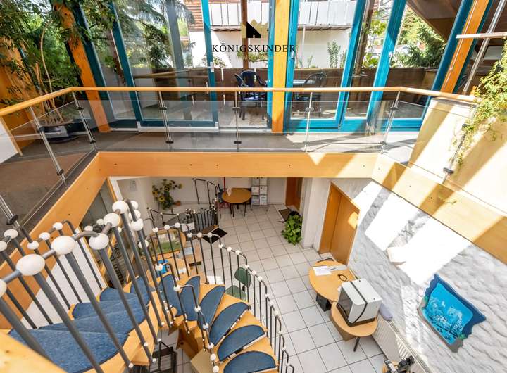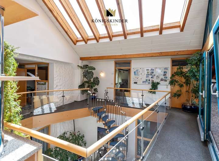 Aktuell als 4-Zimmer-Büro genutzt, mit beeindruckender Dachterrasse (143 m²). Eine Umnutzung zu offenem, hellem Wohnraum ist denkbar. Auch eine gewerbliche Nutzung mit Vermietung bleibt eine attraktive Option.
