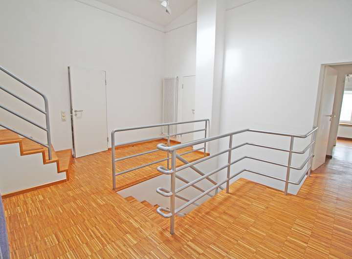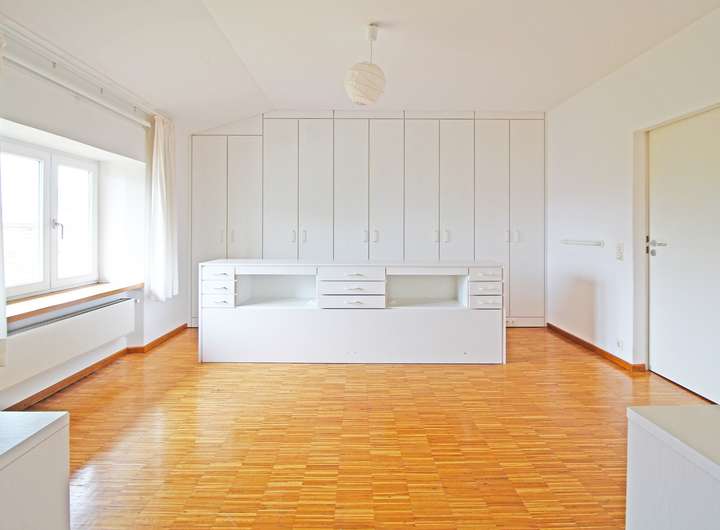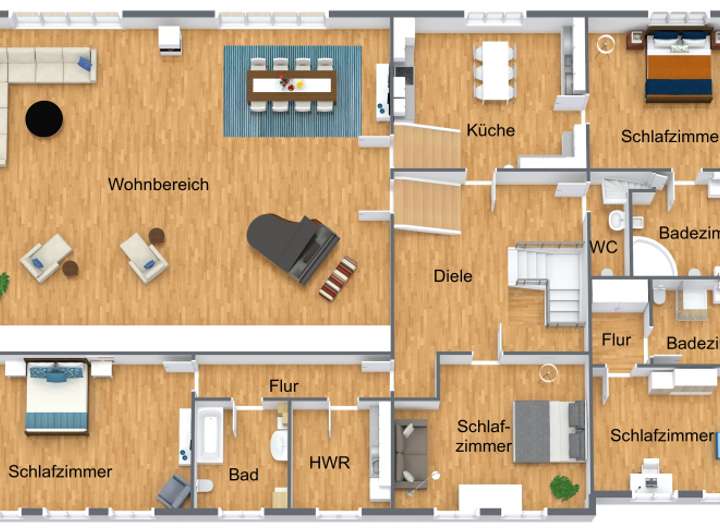 Die ca. 269 m² Wohnfläche im Obergeschoss unterteilt sich in einen ca. 100 m² großen Wohnbereich, vier Schlafzimmer, eine Küche ausgestattet mit Einbauküche, drei Bäder, ein Gäste-WC, zwei Flure und einen Hauswirtschaftsraum.