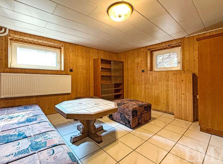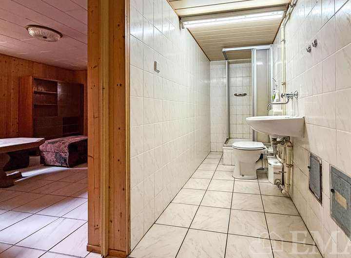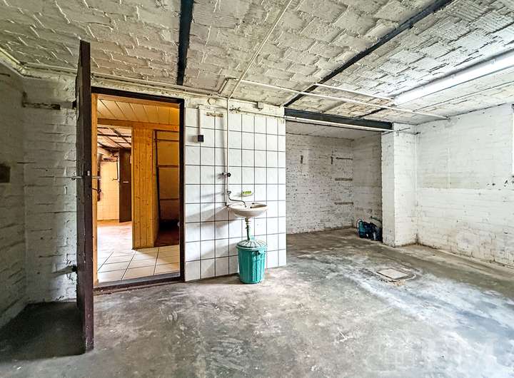 Im Vollkeller befinden sich ein Raum, ein weiterer Raum mit der Heiztechnik und den Ölvorräten, ein Badezimmer mit Dusche, ein beheizter Raum mit der Möglichkeit für ein Gästezimmer oder ein Homeoffice, ein Flur sowie eine Tiefgarage. Die Nutzfläche im Vollkeller beträgt ca. 78 m².