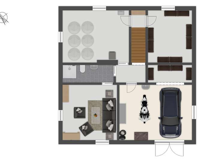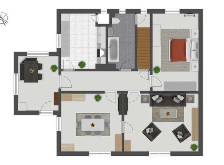 Das Haus teilt sich auf in ein Erdgeschoss, ein Dachgeschoss und einen Vollkeller.