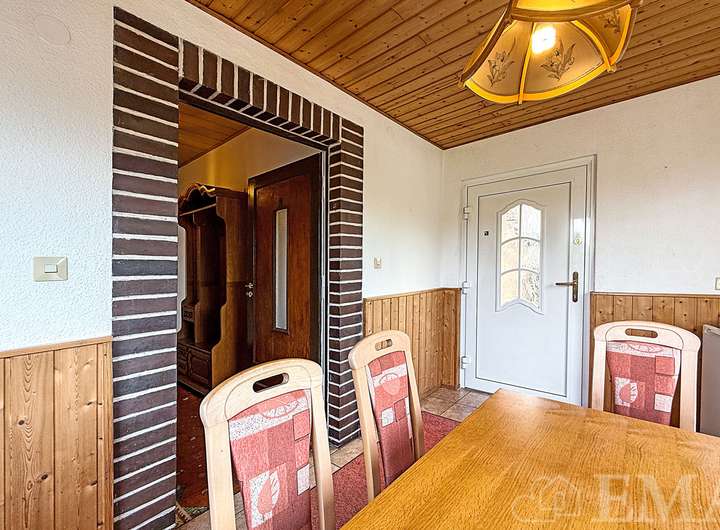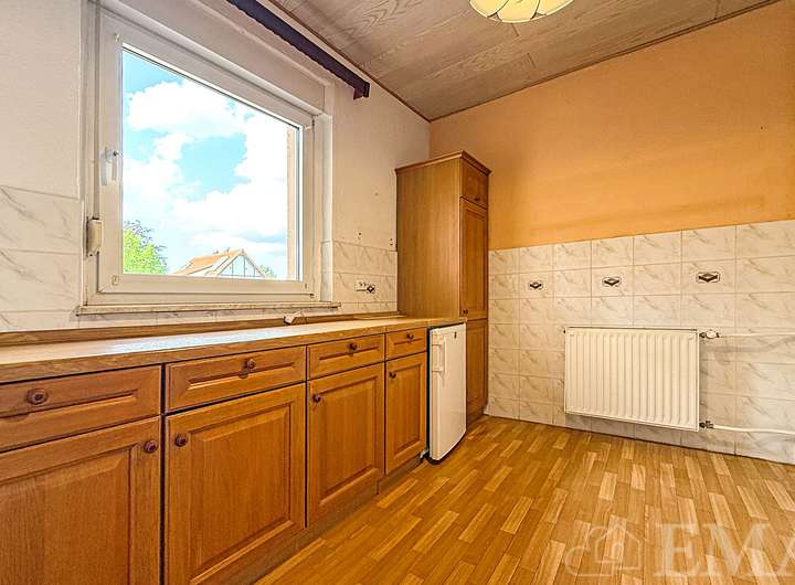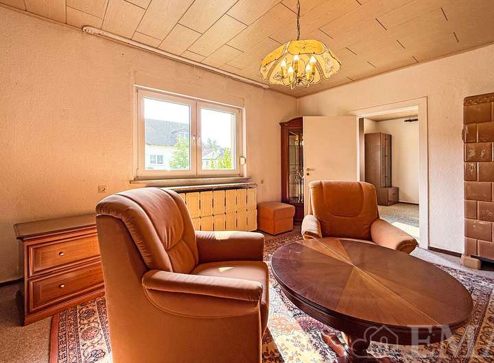 Im Erdgeschoss befinden sich ein Wohnzimmer mit dekorativem Kachelofen und Durchgang zum Essbereich, ein weiteres Zimmer, eine Küche mit Einbauküche und Speisekammer, ein Badezimmer mit Badewanne und Zugang zum Dachgeschoss, eine große Veranda sowie ein Flur. Im Flur führt eine Treppe in den Vollkeller. Die Wohnfläche im Erdgeschoss beträgt ca. 88 m².