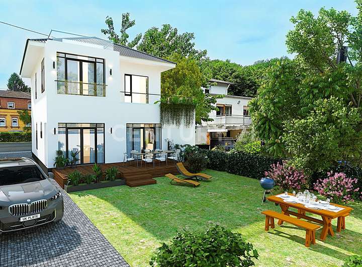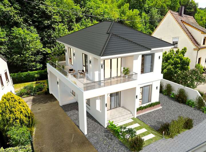 Als Beispiel für die vielfältigen Gestaltungsmöglichkeiten haben wir eine Vision erstellt, die zeigt, wie attraktiv und funktional Ihr zukünftiges Zuhause aussehen könnte. Das Grundstück ist ca. 30 Meter tief, was ausreichend Raum für individuelle Grundrisse und Außenanlagen bietet.