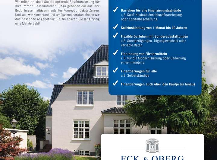 Gern sind wir Ihnen auch bei der Finanzierung Ihrer Wunsch-Immobilie behilflich. Unsere Finanzierungs-Fachleute beraten Sie persönlich, individuell und bankenunabhängig.